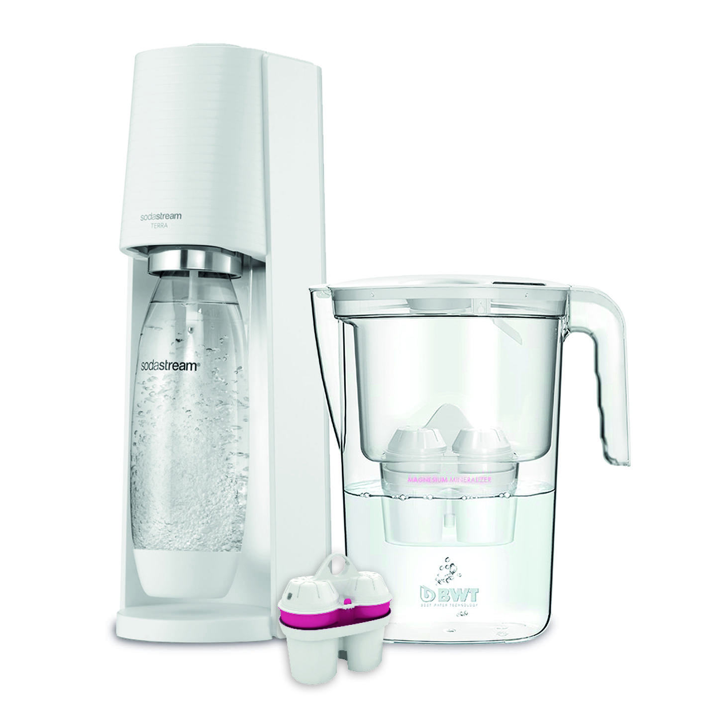 Gasatore terra white confezione dotata di 1 gasatore,1 bottiglia da 1 lt in plastica lavabile in lavastoviglie e 1 cilindro di co2 quick connect+Caraffa bwt…. Accessorio ideale per gasatori dโacqua e sistemi di gasatura domestici. Perfetto per ottenere acqua frizzante in modo pratico e veloce.